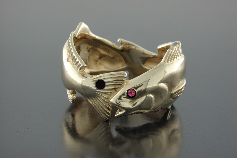 14K Yellow Gold Double Redfish Ring with .02ct. ruby eyes. Measures 10.0mm at widest point of ring. Available in Yellow or White Gold All items are custom made in the U.S.A.