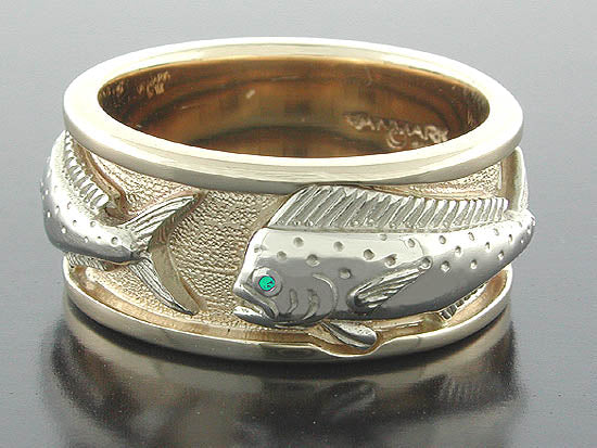 Example ring shown: 14K yellow gold (inner color) with three Bull Dolphin shown (outer color) set with .01ct. emerald eyes.