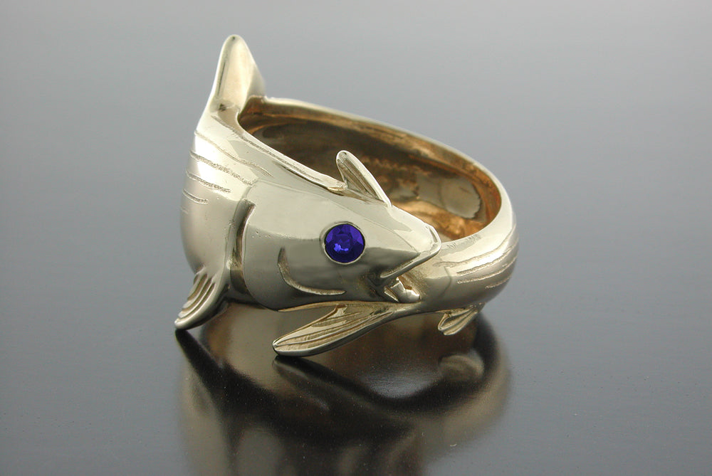 14K Yellow Gold Large Bonefish Ring with .04ct. sapphire eye. Measures 11.0mm at widest point of ring. Available in Yellow or White Gold Size Chart All items are custom made in the U.S.A.