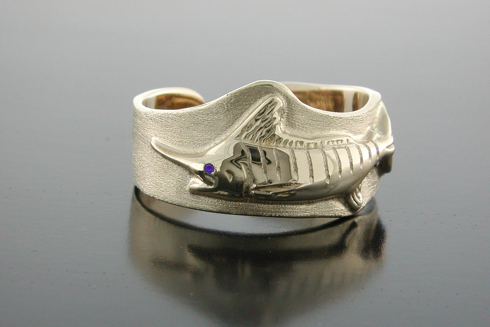14K Yellow Gold Marlin Toe Ring with .01ct. sapphire eye. The ring is opened on the bottom side to enable for different sizes. All items are custom made in the U.S.A.