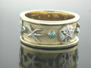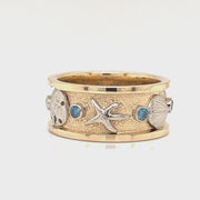 Ladies 9.5mm ring, shells with 5 .03ct. blue diamonds set in bezels. Yellow gold band, white gold sea shells. Available in Yellow and White Gold Size Chart All items are custom made in the U.S.A.