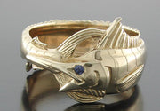 14K Yellow Gold Men's Marlin Ring with .02ct. sapphire eye. Measures 12.0mm at top of ring. Available in Yellow or White Gold Size Chart All items are custom made in the U.S.A.