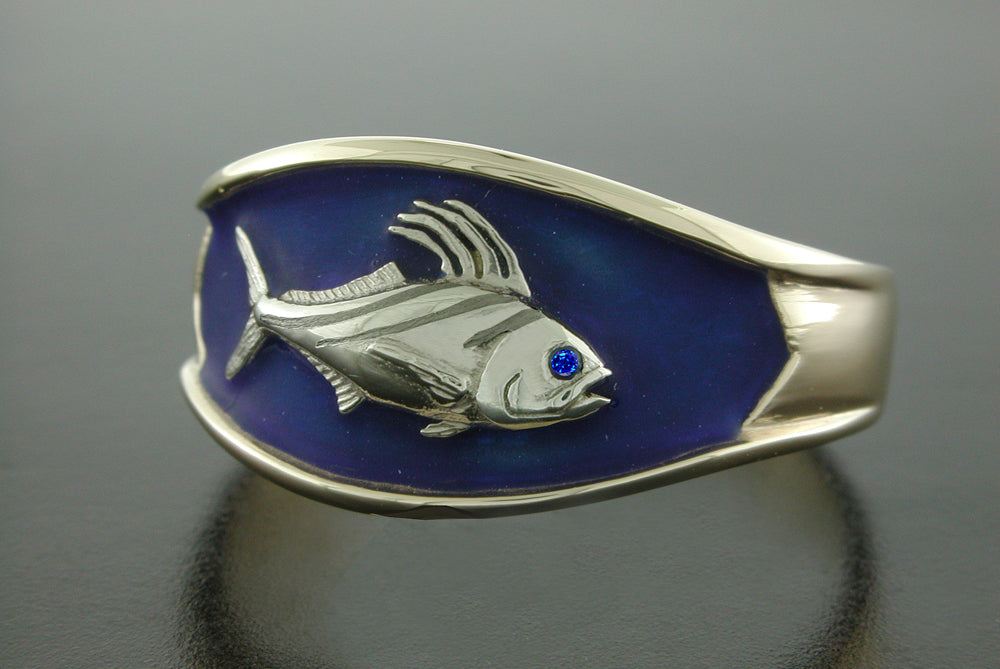 14K white gold Rooster fish on 14K yellow gold ring with .01ct. sapphire eye. There is blue ceramic color on platform back ground. Measures 10.5mm at top of ring and tappers down to 4.0mm thickness Weighs 8.4 grams. Size Chart All items are custom made in the U.S.A.