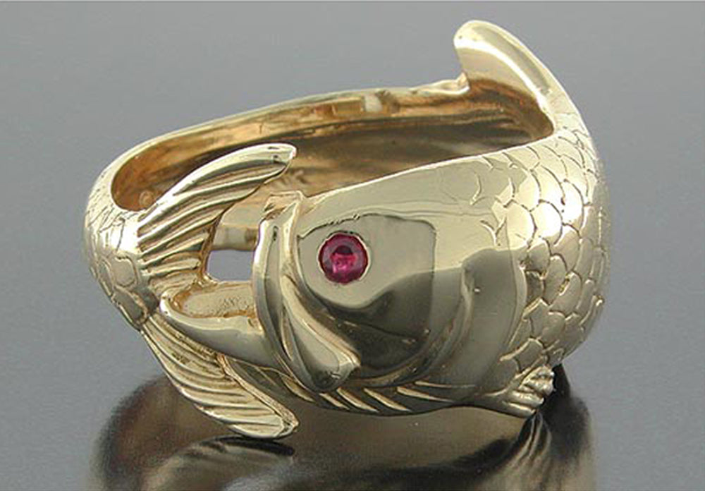 14K Yellow Gold Single Tarpon wrap Ring with .06ct. ruby eye. Measures 12.0mm at widest point of ring. Size Chart All items are custom made in the U.S.A.