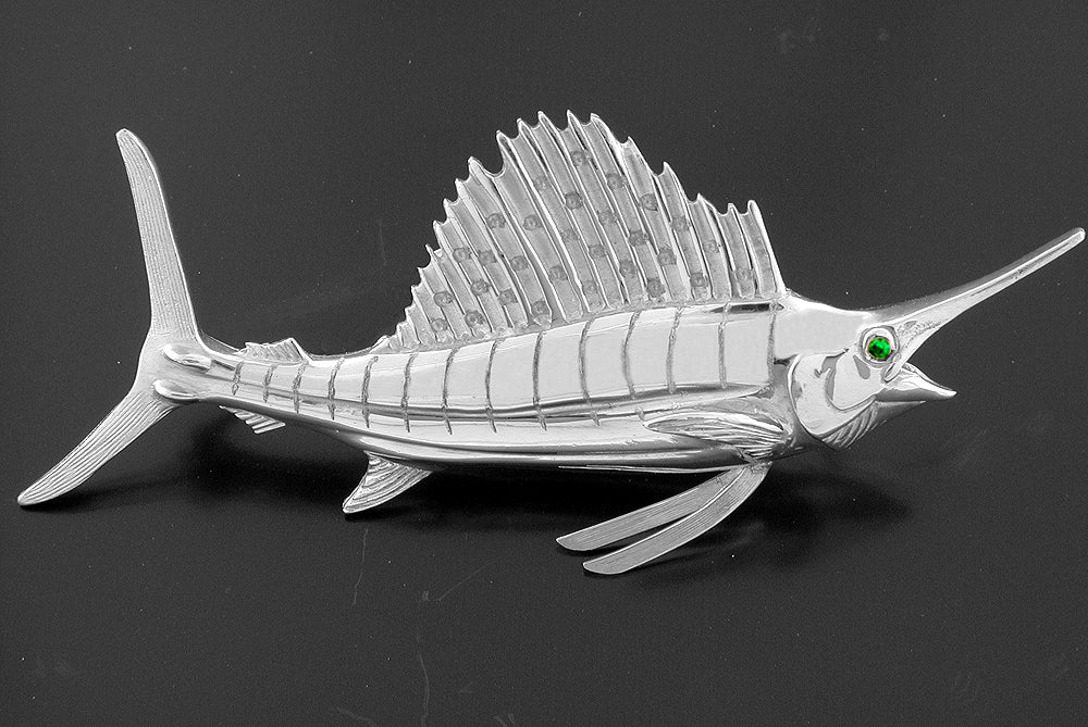 Sterling Silver large Sailfish Pendant with .02ct. emerald eye. Offered half round. Measures 2.75" wide.