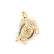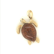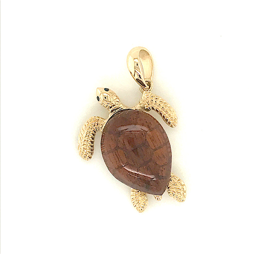 14K yellow gold logger head turtle pendant with a carved teak wood turtle back. Measures 1.0" tall and weighs 4.1 Dwt. or 6.3 grams. The eyes are set with two .01ct. blue sapphires.
