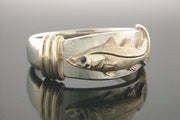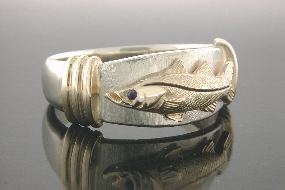 14K White Gold Ring (inner color) with Yellow Snook and side bars (outer color). This is a 8.0mm wide ring. Comes in a standard size 9.5 with .01ct. sapphire eye. Available in Yellow or White Gold All items are custom made in the U.S.A.