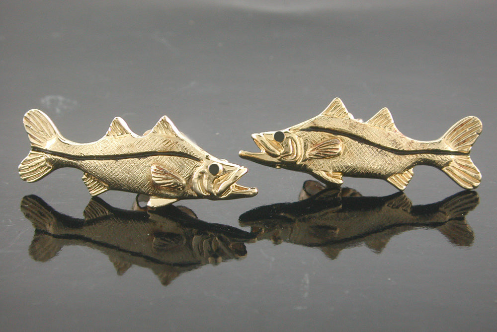 14K yellow gold small Snook earrings with post friction backs. Measures .75" long Available in Yellow or White Gold All items are custom made in the U.S.A.