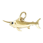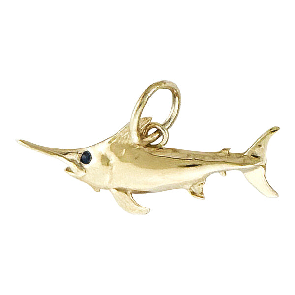 14K yellow gold Swordfish Charm with .01ct. blue sapphire set eye and measures 7/8" long and has a 4.0mm opening jump ring. Offered in half round/detail only on one side and weighs .9 grams.