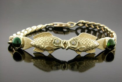 14K Yellow Gold Kissing Fish Bracelet with.02ct. Diamond eyes and 4.5mm Green Tourmaline Bezel set Cabochon cut stones. This 7.5" long bracelet is hinged in the center for fitting movement and is finished from the tails of the fish with a 3.5mm Curb link chain then connected to a Lobster Claw Clasp. " Sure to wet your lips ". All items are custom made in the U.S.A.